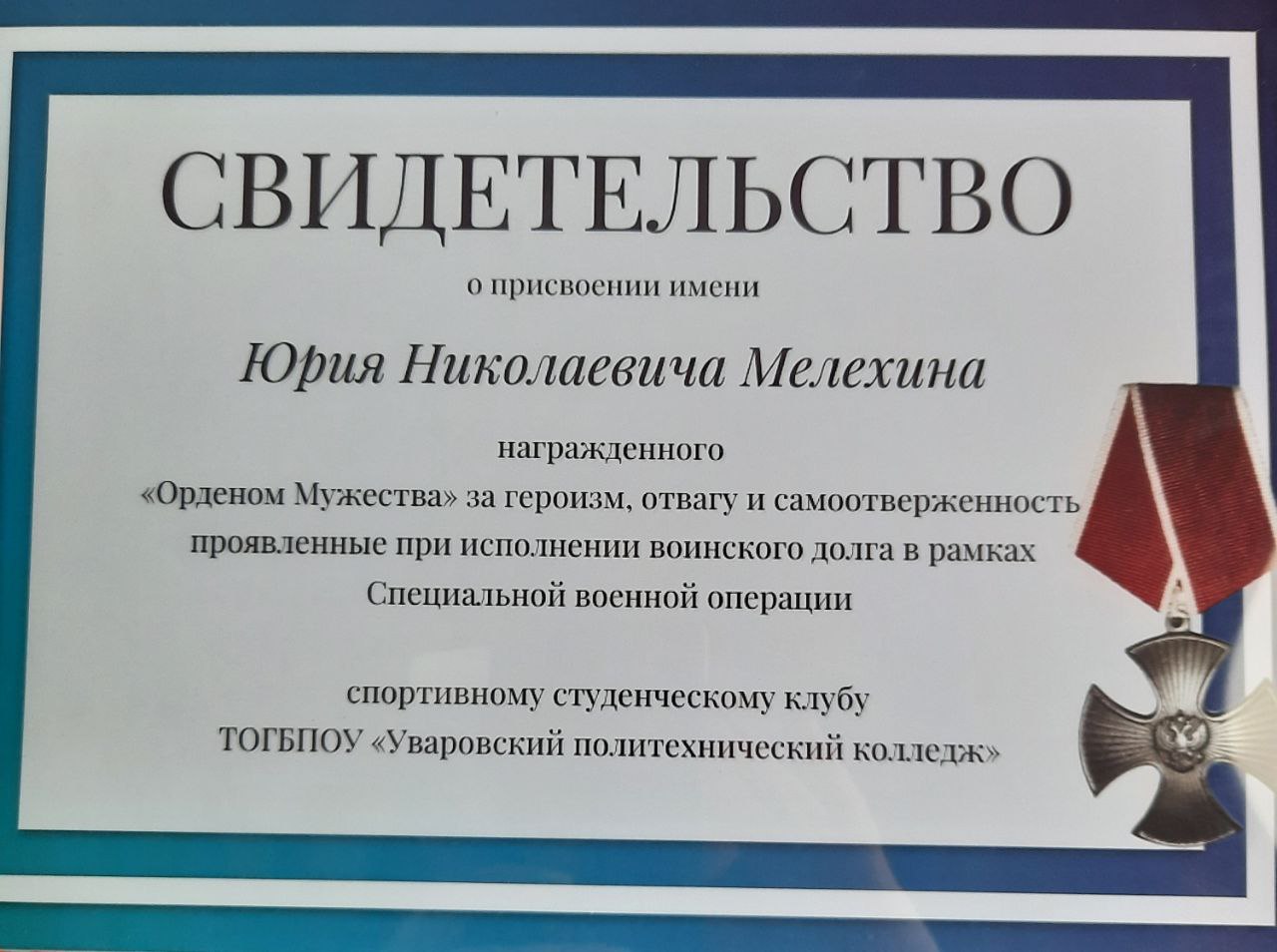 Студенческий спортивный клуб «Юность» Уваровского политехнического колледжа принял участие в первенстве по волейболу среди ССК на приз героя РФ Заволянского В. И. На этом мероприятии нашему клубу было присвоено имя выпускника Уваровского колледжа Мелехина Ю.Н., героя специальной военной операции. Супруга героя подарила студенческому спортивному клубу майки с портретом мужа. Мы гордимся нашим выпускником, держим равнение на героя!