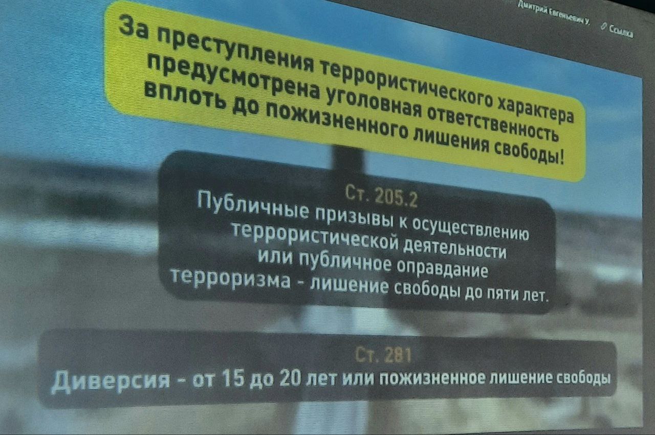Студенты и преподаватели колледжа приняли участие в открытом уроке в форме ВКС по профилактике вовлечения подростков в экстремистские группировки. Ребята узнали об ответственности за преступления террористического характера, как заблокировать сайт с запрещенным контентом, алгоритм действий подростков.