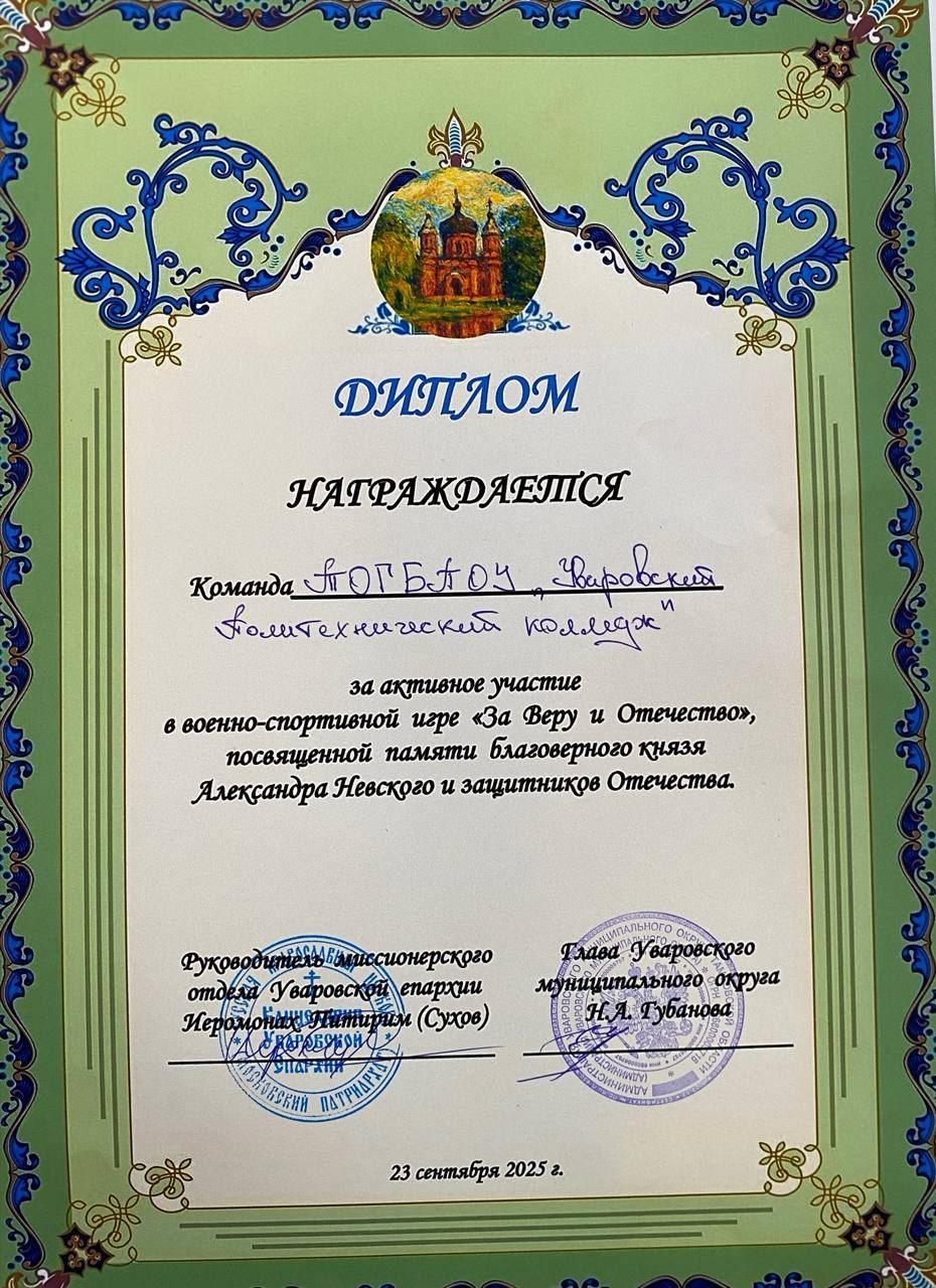 Команда студентов колледжа приняла участие в военно- спортивной игре «За Веру и Отечество», посвящённой памяти благоверного князя Александра Невского и защитникам Отечества. Поздравляем команду и их руководителей. Так держать!