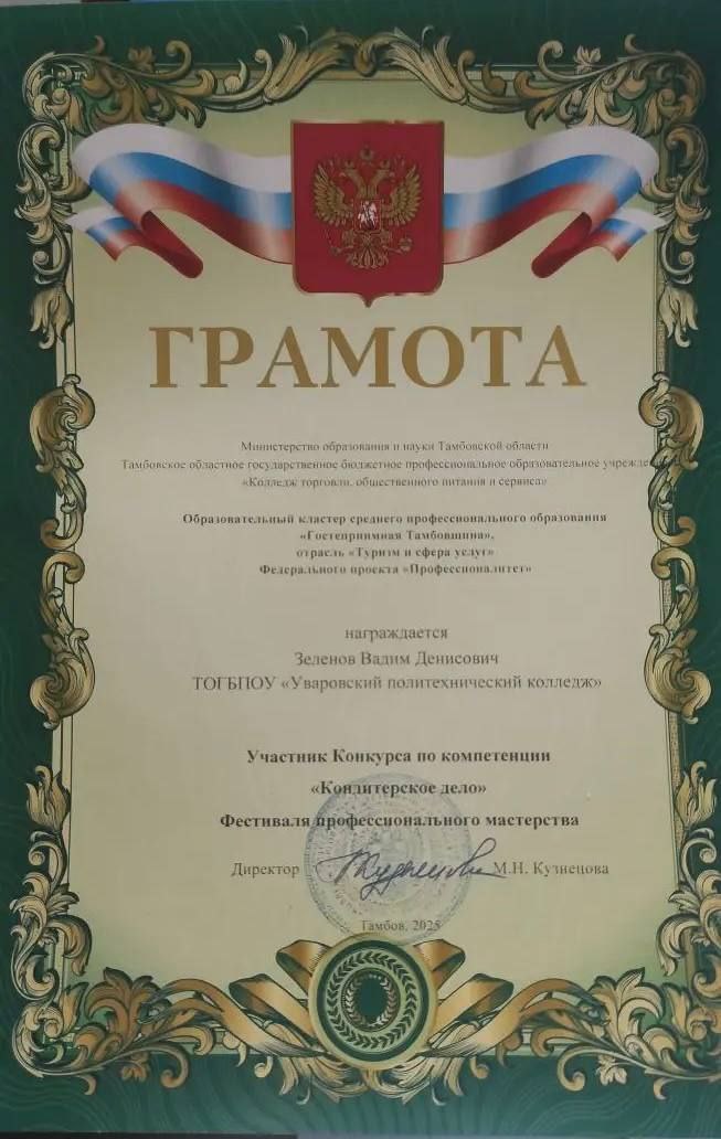 Амбассадор профессионалитета Уваровского политехнического колледжа профессии Повар, кондитер Зеленов Вадим принял участие в финальном этапе осеннего фестиваля профессионального мастерства кондитеров, обучающихся в рамках федерального проекта «Профессионалитет» национального проекта «Молодёжь и дети». Студент продемонстрировал свои творческие кулинарные способности, получил новые знания и профессиональные навыки.